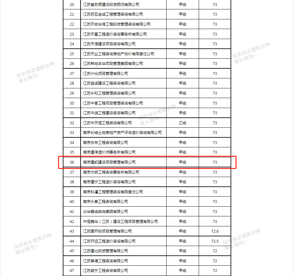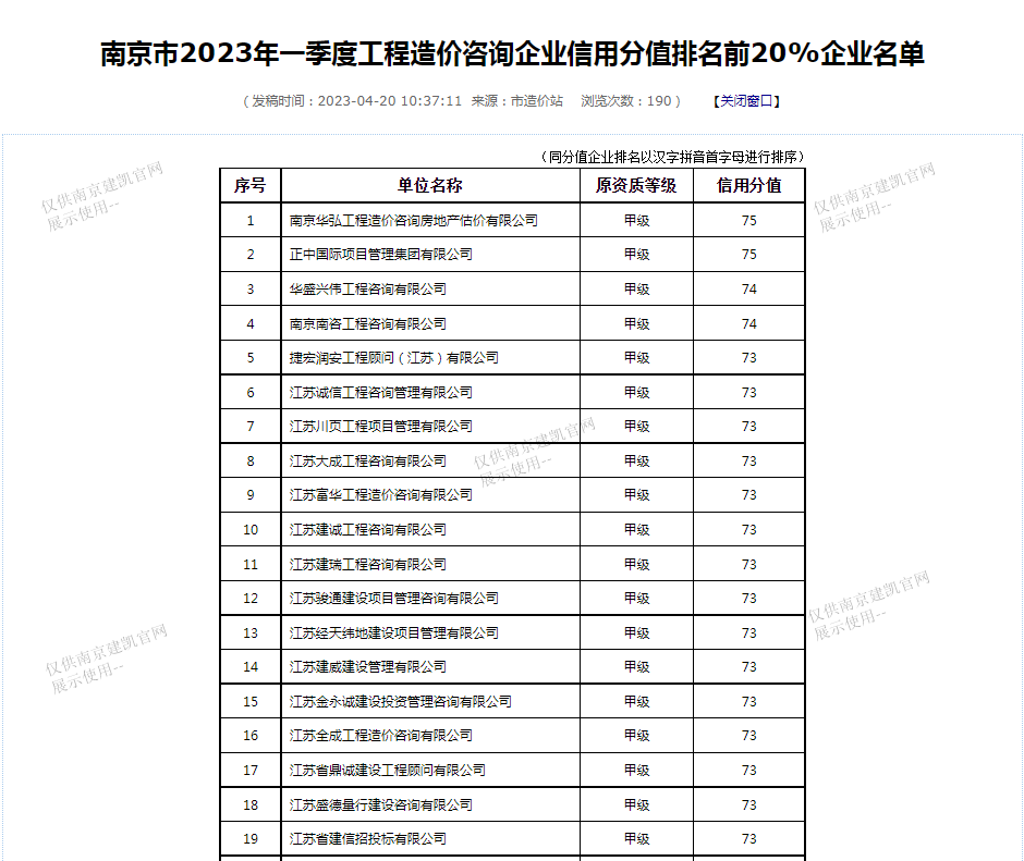 恭喜我司入選“南京市2023年一季度工程造價(jià)咨詢(xún)企業(yè)信用分值排名前20%企業(yè)名單”