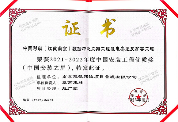 熱烈祝賀我司中國移動(dòng)(江蘇南京)數據中心二期工程機電安裝及擴容工程監理部榮獲“2021-2022年度中國安裝工程優(yōu)質(zhì)獎”