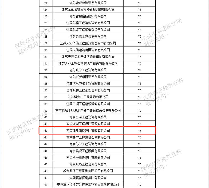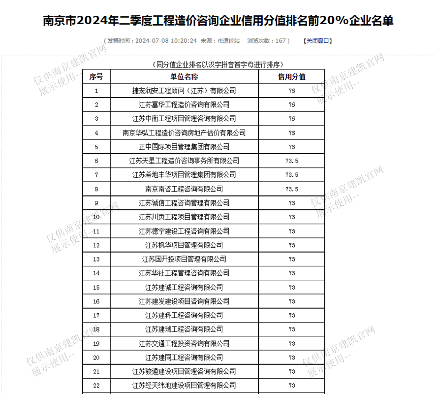恭喜我司入選“南京市2024年二季度工程造價(jià)咨詢(xún)企業(yè)信用分值排名前20%企業(yè)名單”