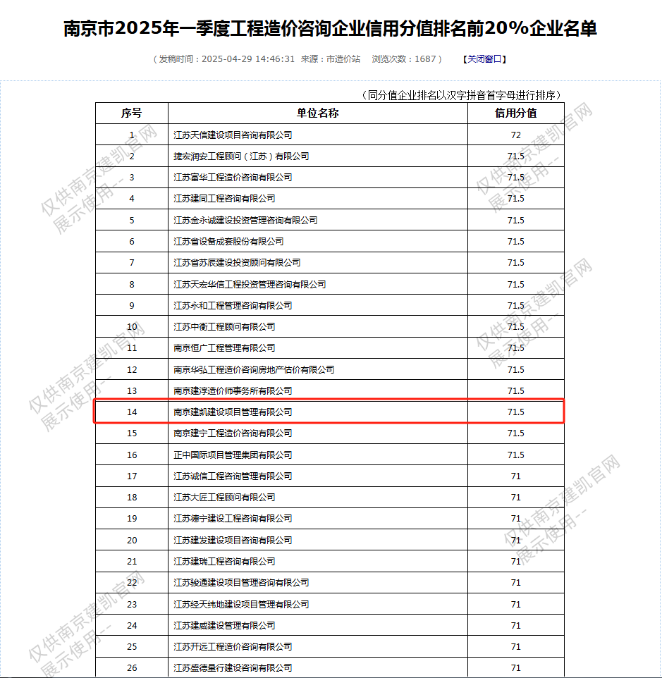 恭喜我司入選“南京市2025年一季度工程造價(jià)咨詢(xún)企業(yè)信用分值排名前20%企業(yè)名單”