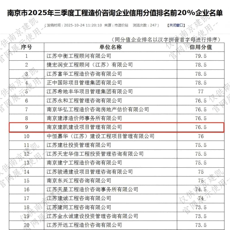 恭喜我司入選“南京市2025年三季度工程造價(jià)咨詢(xún)企業(yè)信用分值排名前20%企業(yè)名單”