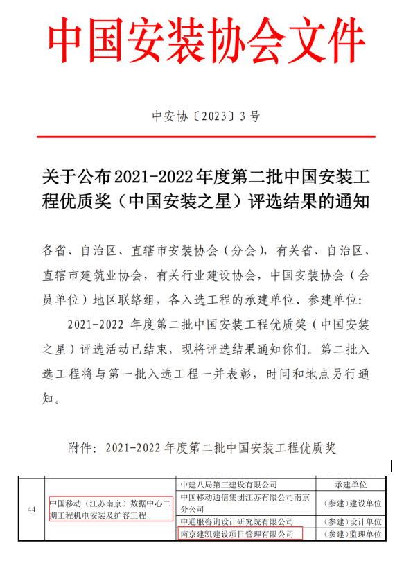 中國移動(dòng)(江蘇南京)數據中心二期工程機電安裝及擴容工程榮獲“中國安裝工程優(yōu)質(zhì)獎(中國安裝之星)”獎