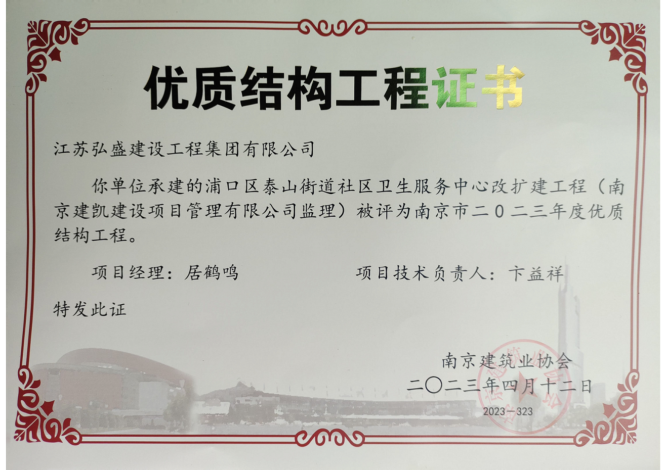 浦口區泰山街道社區衛生服務(wù)中心改擴建工程榮獲“2023年度優(yōu)質(zhì)結構工程”
