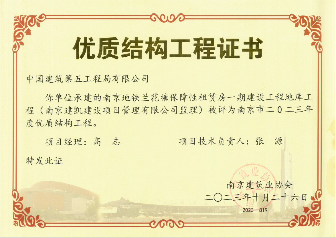南京地鐵蘭花塘保障性租賃房一期建設工程地庫工程榮獲“優(yōu)質(zhì)結構工程證書(shū)”