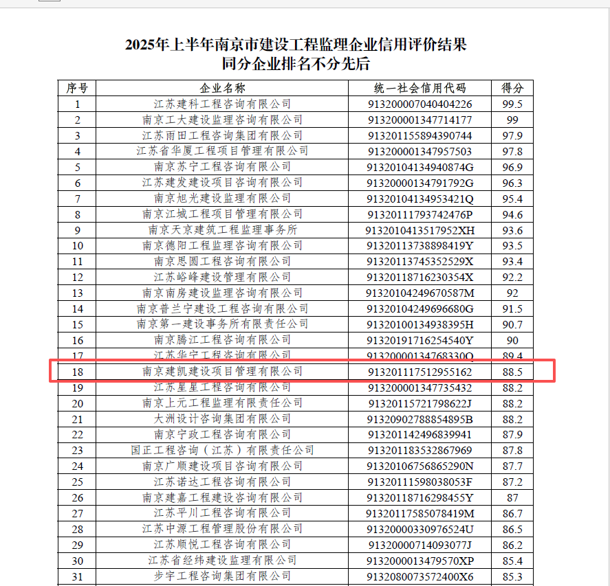 2025年上半年南京市建設工程監理企業(yè)信用評價(jià)結果