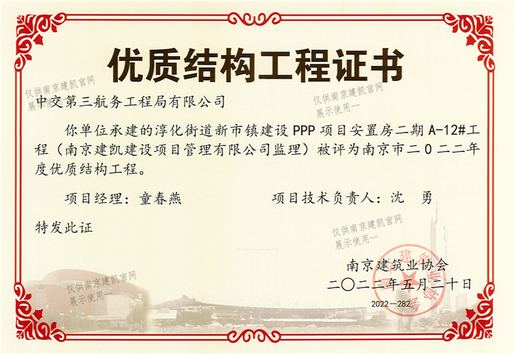 南京市二0二二年度優(yōu)質(zhì)結構工程(淳化街道新市鎮建設PPP項目安置房二期A(yíng)-12#工程)